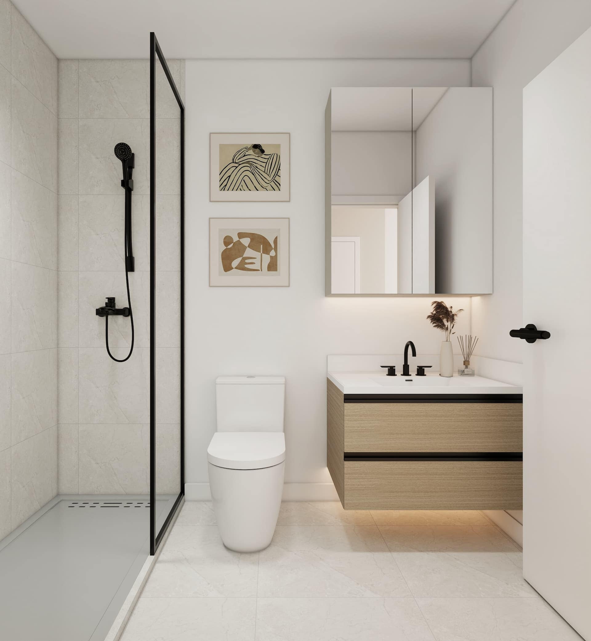 - Matte black bathroom fixtures