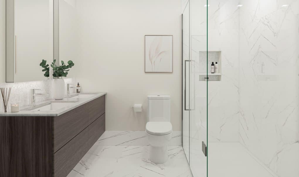 - Spa-inspired bathrooms with floating vanities, frameless glass showers, and porcelain tile