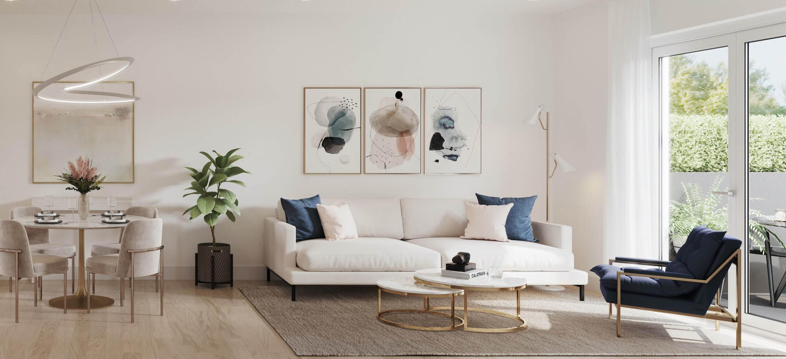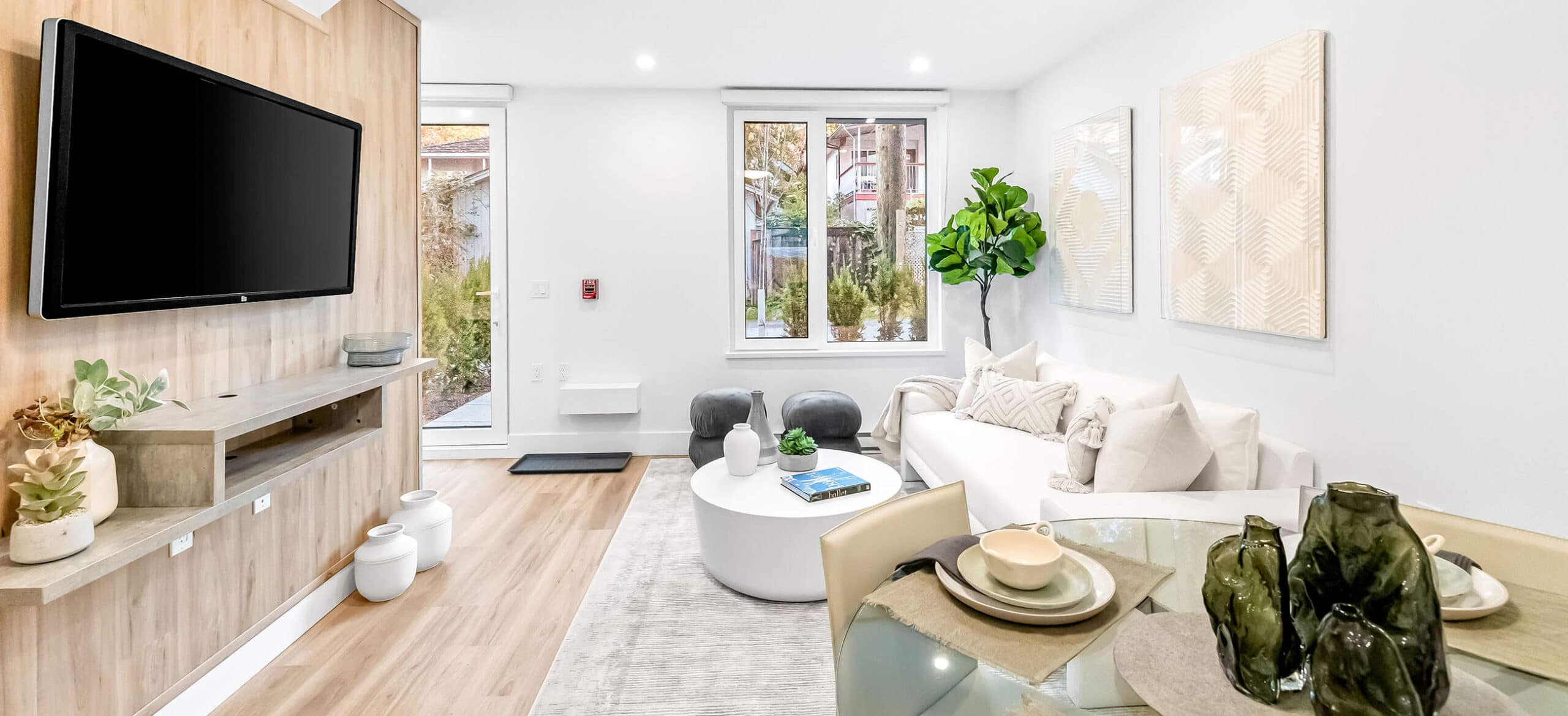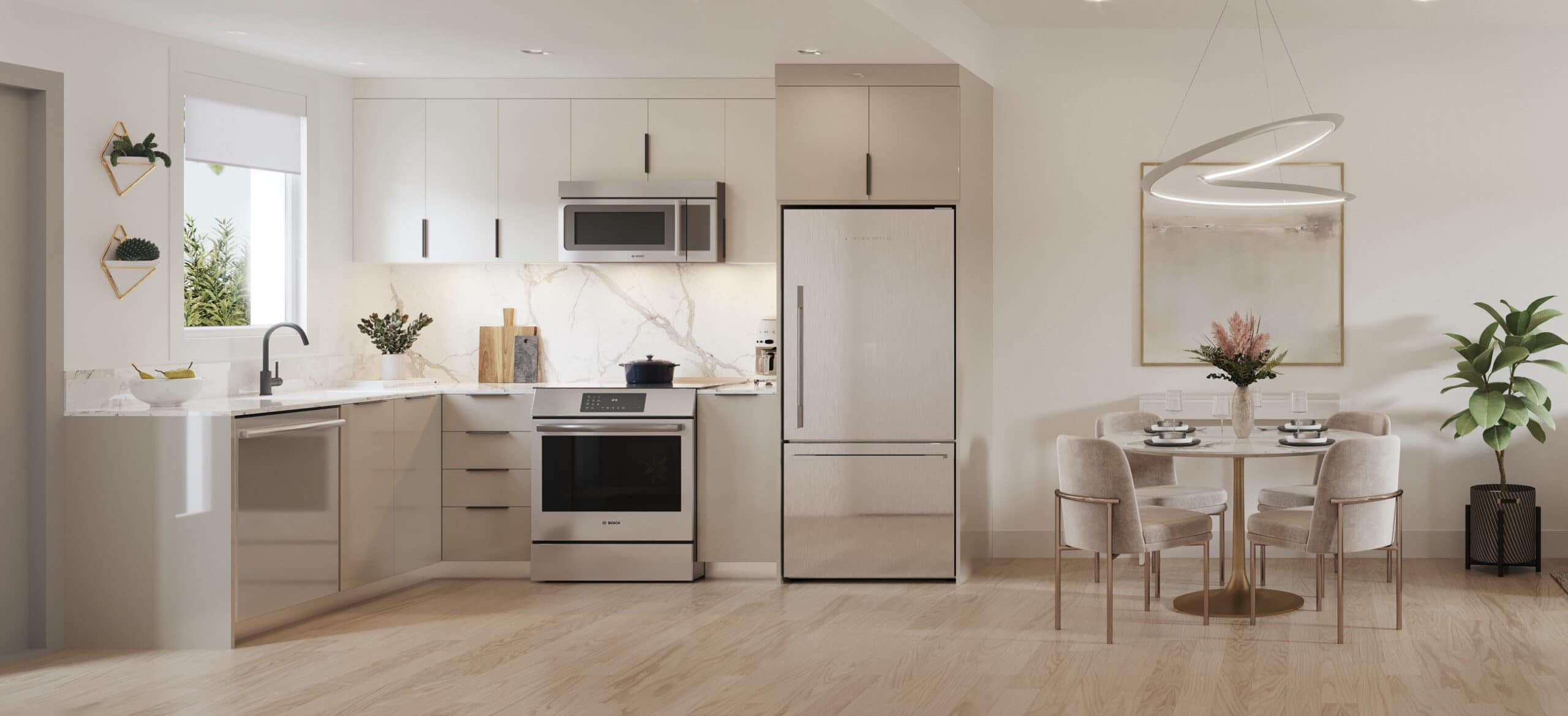 Homes range from spacious three-bedroom-plus-flex townhomes to well-designed one-bedroom-plus-flex residences, with layouts that prioritize natural light, storage, and flexible living. Interiors reflect a clean, European-inspired aesthetic, with two curated colour schemes that let homeowners choose between classic warmth and modern contrast.