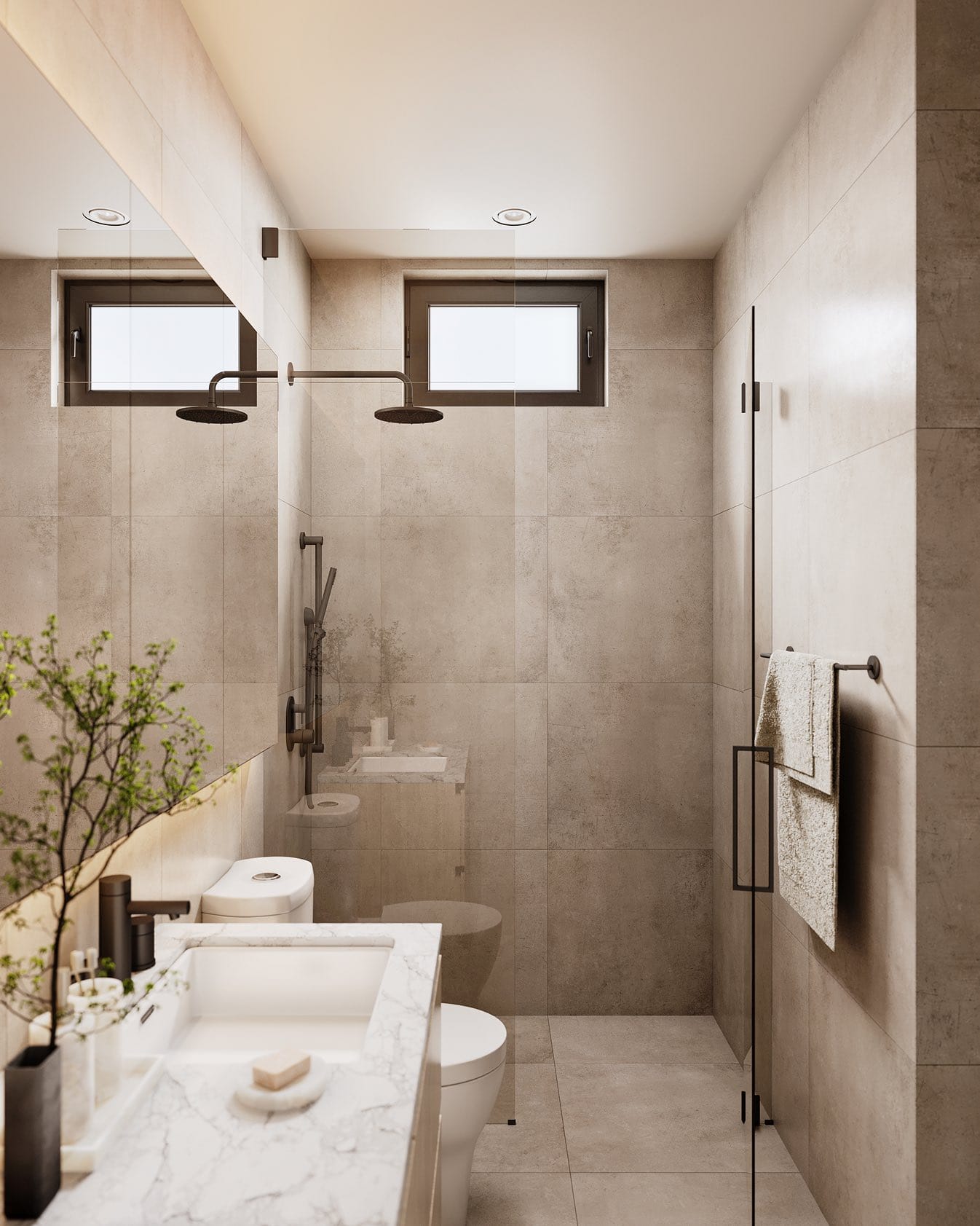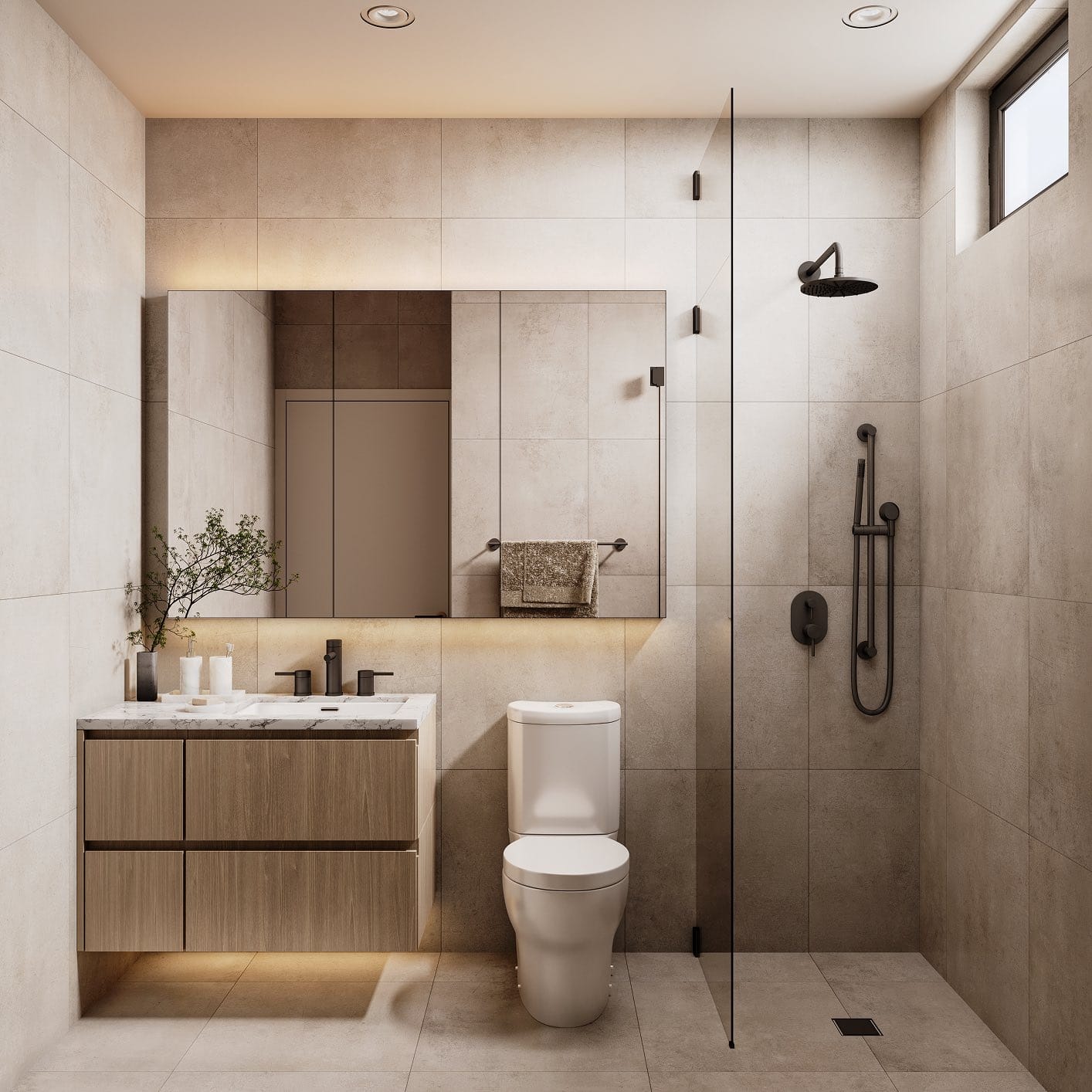 - Wide-format porcelain tile in bathrooms