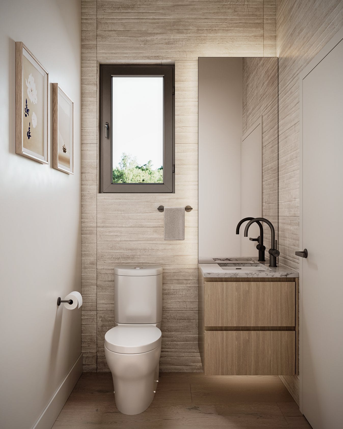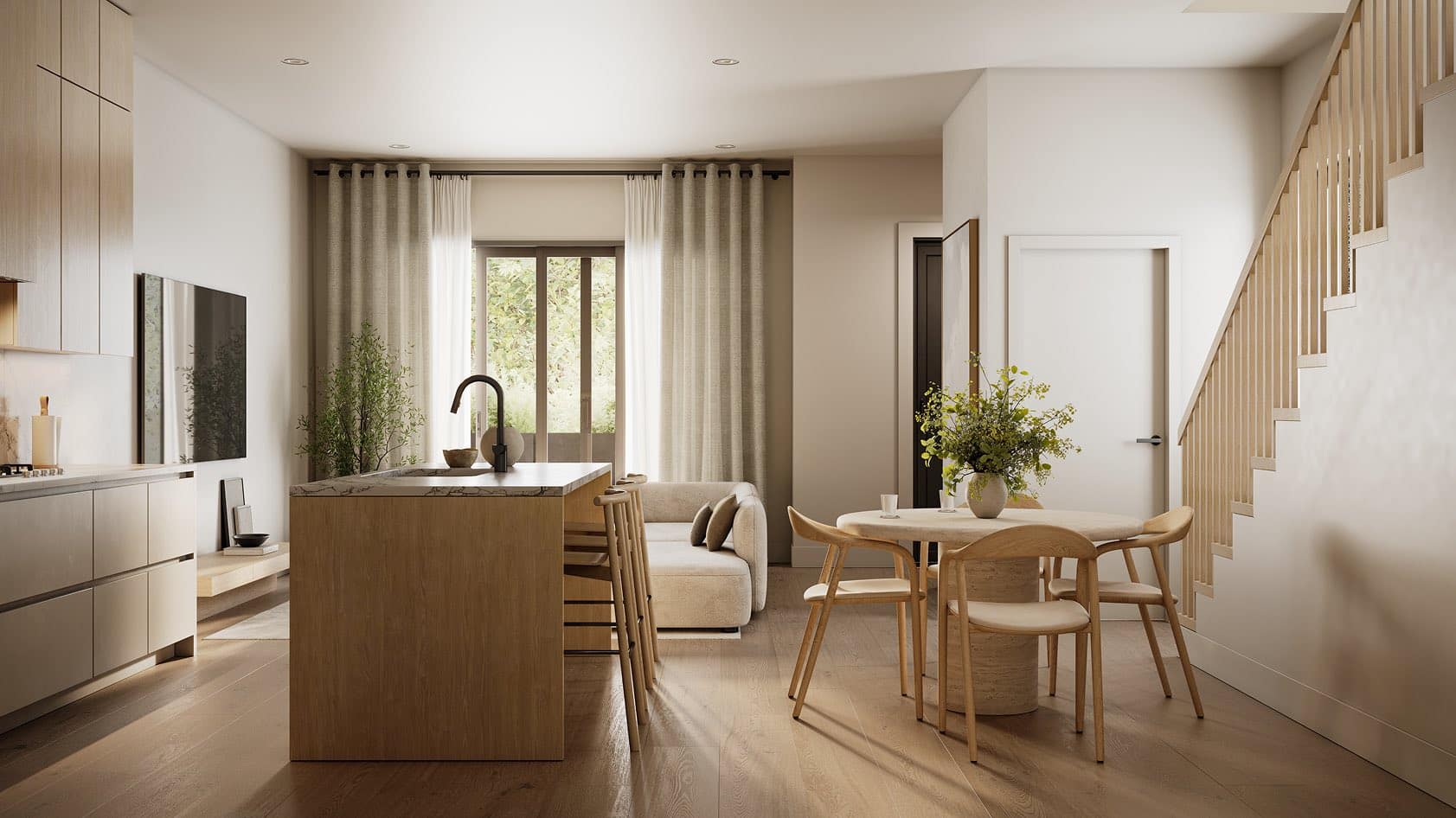 Inside, each residence is shaped by clean architectural lines and a palette rooted in natural warmth. Overheight ceilings and white oak engineered hardwood floors set the tone for an open, comfortable living space. Wide-format tiles, matte black fixtures, and thoughtful millwork bring a quiet confidence to every room. The layouts support easy movement between spaces, while large windows invite natural light throughout the day.