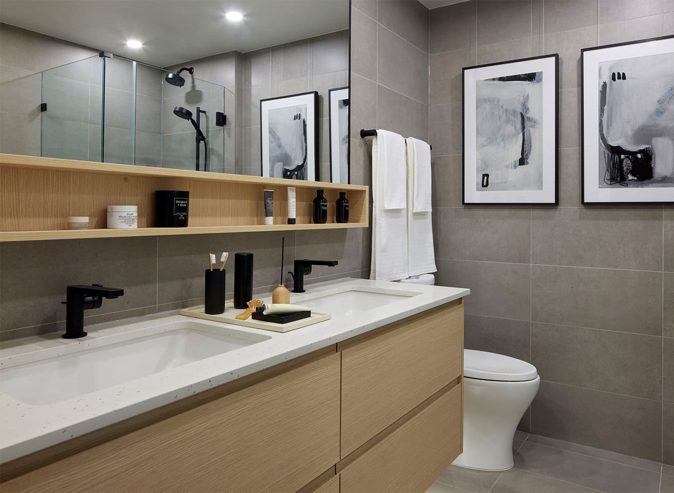Interiors balance modern style with comfort and functionality. Buyers can choose from three designer colour palettes, and many homes include architectural features such as skylights, glass railings, solid wood staircases, and custom storage solutions. Kitchens are designed for daily living and entertaining, with premium integrated appliances, quartz countertops, and thoughtful storage details. Bathrooms offer a calm, spa-like feel with quality fixtures and heated floors in ensuite spaces.