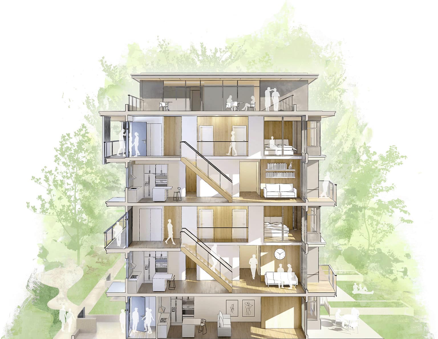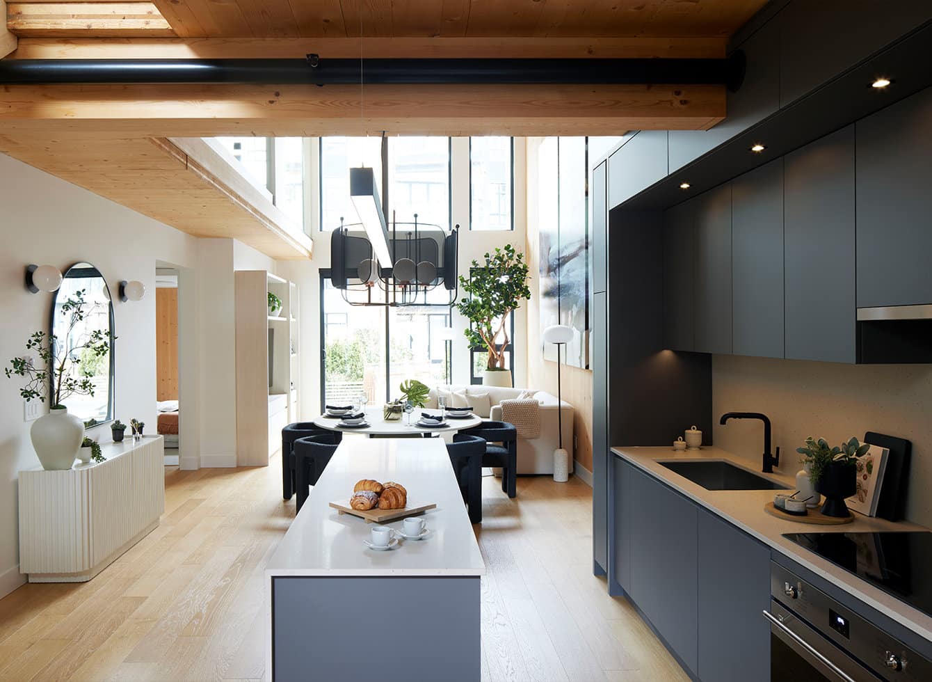 The homes at Timber House are defined by Aragonโs focus on natural materials, livability, and long-term durability. Built with innovative cross-laminated timber (CLT), these residences feature wide-open spans, large windows, and warm wood elements that create bright, healthy interiors. Select homes feature exposed CLT walls and ceilings, highlighting the structure itself as part of the design while also supporting sustainability goals through reduced carbon impact and responsible forestry practices.