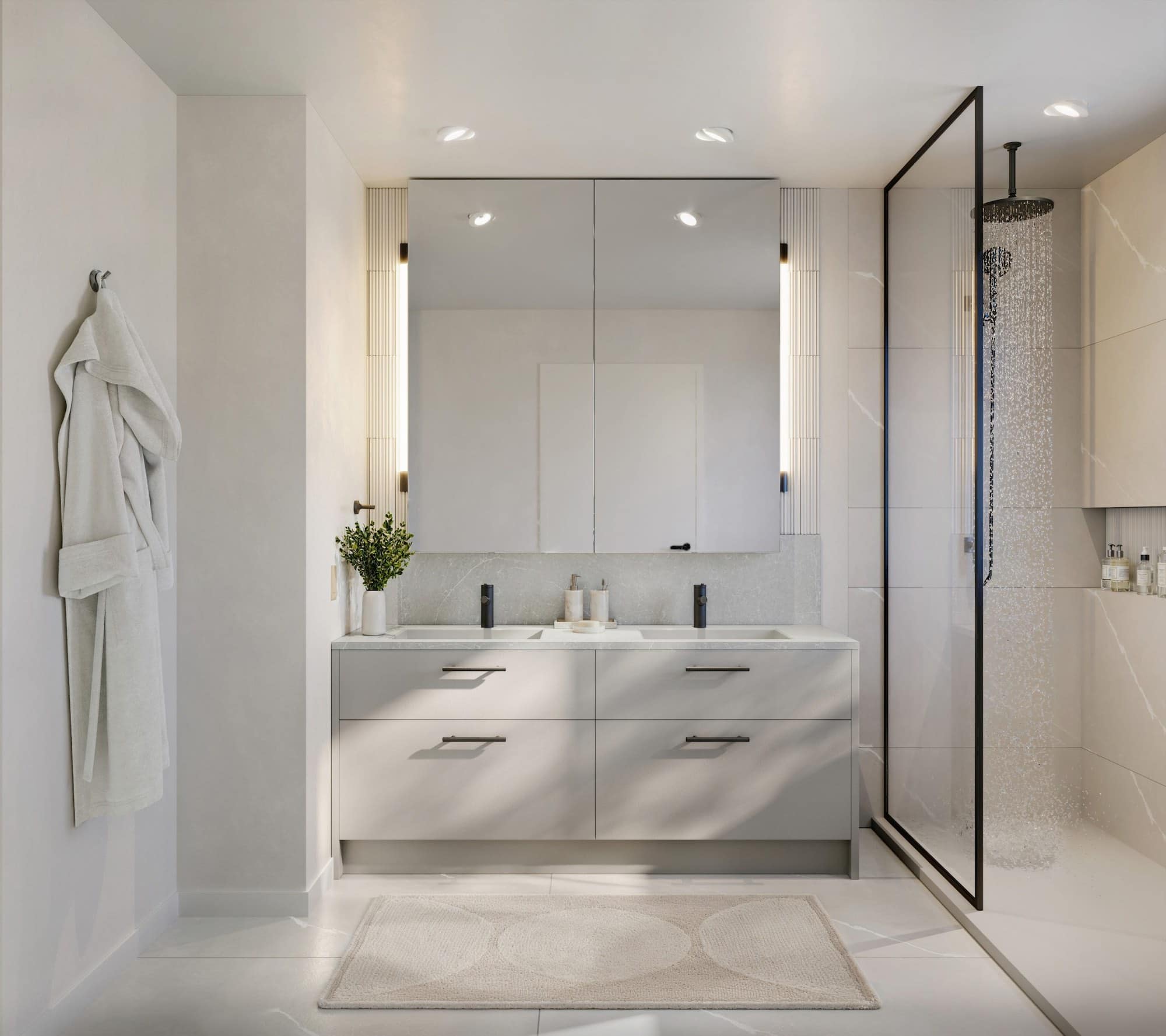 - Spa-inspired bathrooms with Italian cabinetry, matte black Kohler fixtures, a rain shower, and a composite stone shower tray