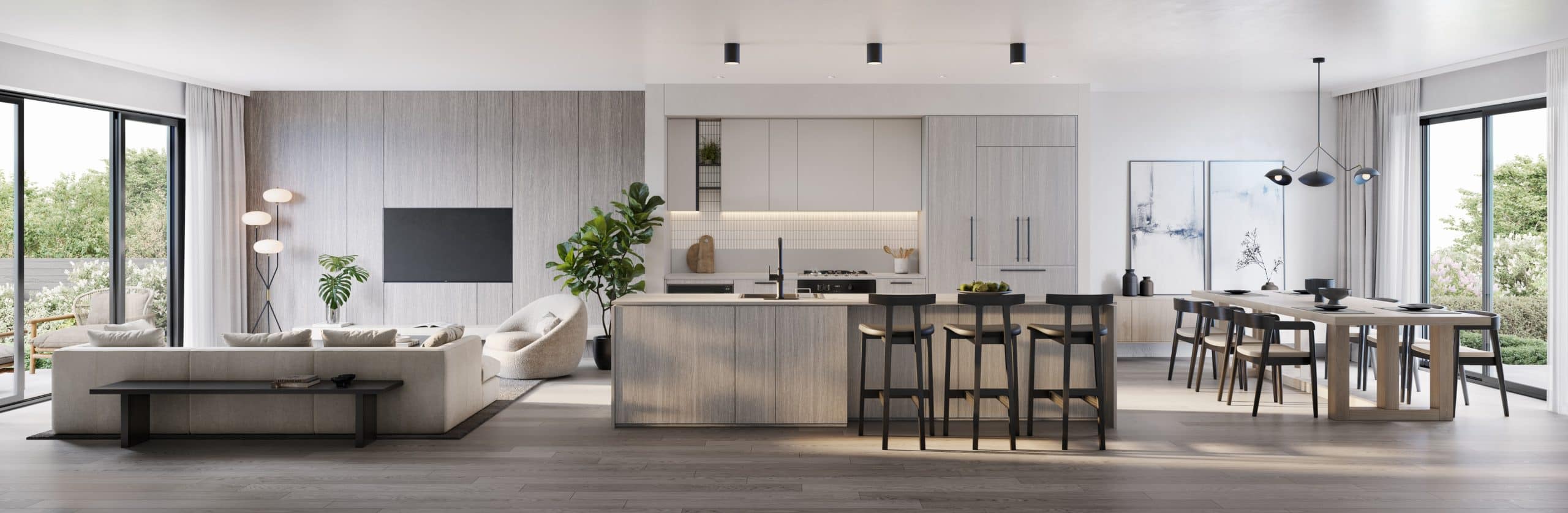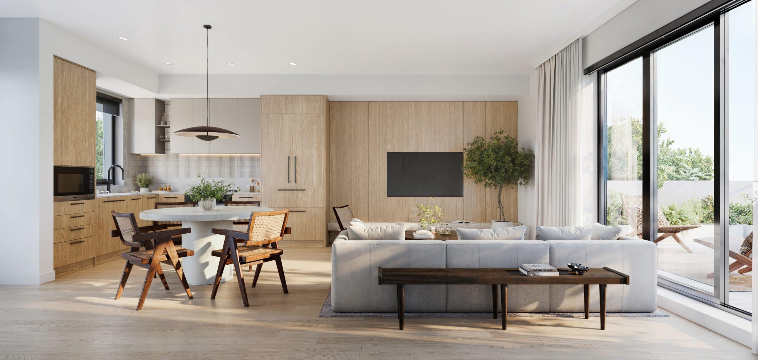 Inside, materials and details are crafted for longevity and everyday comfort. Kitchens include Italian Aran Cucine cabinetry, quartz countertops, Miele appliances, and thoughtful storage. Spa-inspired bathrooms feature natural tones, spacious vanities, and matte-black Kohler fixtures. Air conditioning, engineered-wood flooring, and quiet-close finishing touches complete the experience.